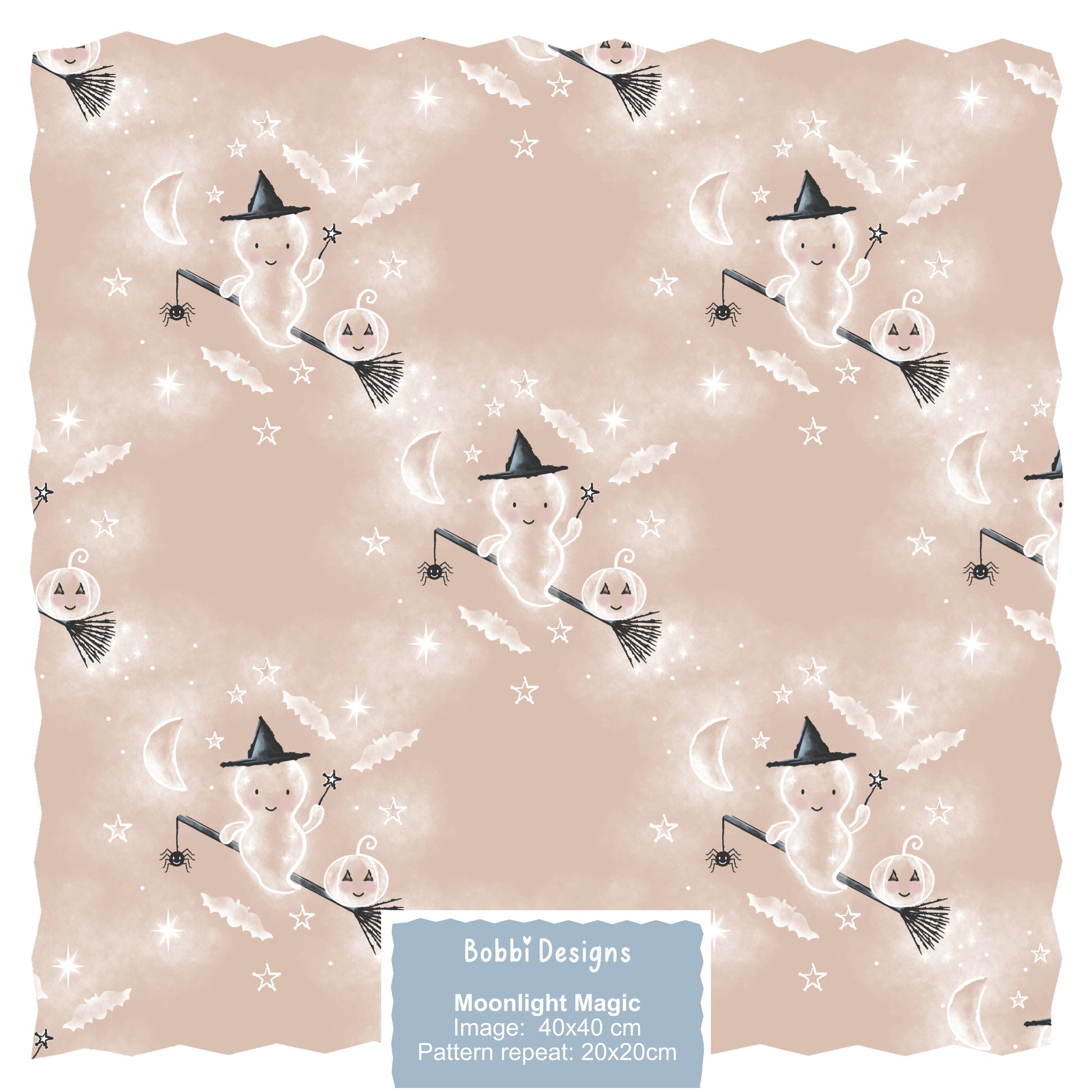 This delightful illustration is perfect for Halloween! Fly with 'Spook' the ghost through a starry, moonlit night full of magic! Created with inks and watercolour brushes this pattern design incorporates ghouls, flying broomsticks, witches hats, magic wands, cute spiders, bats and of course pumpkins - lots of Halloween elements in one beautiful design! Ideal for creating kids clothing ranges, fabric printing, toys, stationery and home crafting. This design includes a standard commercial license as well as FREE co-ordinating patterns!
