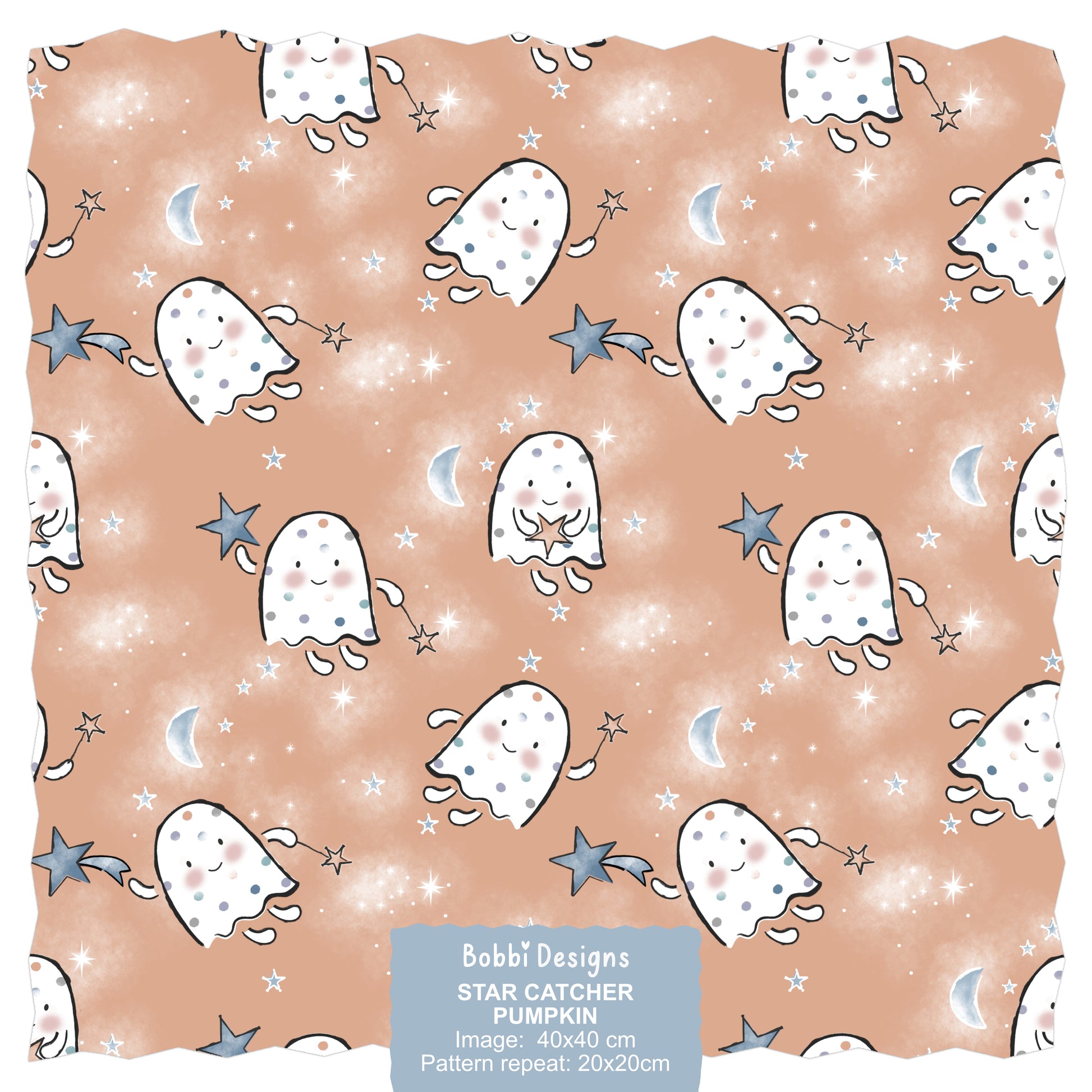 Celebrate the Halloween season with this collection of illustrations featuring 'Dotty the Little Ghost.' This playful design features a magical ghost having lots of Halloween fun! This original piece of artwork was created using ink and watercolour brushes and is ideal for creating kids clothing ranges, fabric printing, toys, stationery and home crafting. This design includes a standard commercial license as well as a FREE co-ordinating pattern! This delightful illustration is perfect for creating your Halloween range!